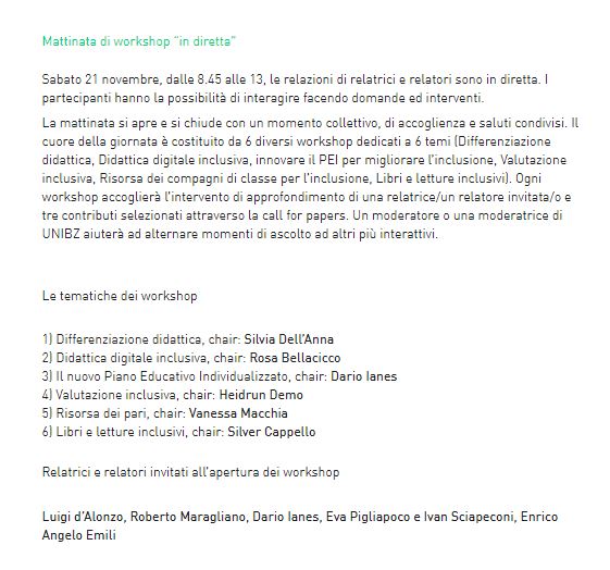 Il programma del Convegno è consultabile al seguente link:https://didatticainclusione.events.unibz.it/?page_id=14